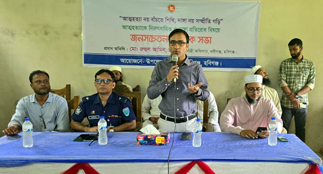 উত্তম কুমার পাল হিমেল, নবীগঞ্জ থেকে ॥ নবীগঞ্জে আত্মহত্যা নিরুৎসাহিতকরণ ও দাঙ্গা প্রতিরোধে সচেতনতা সৃষ্টির লক্ষ্যে উপজেলা প্রশাসনের উদ্যোগে জনসচেতনতামূলক সভা অনুষ্ঠিত হয়েছে। বৃহস্পতিবার (৯ অক্টোবর) সকালে উপজেলার দারুল হিকমাহ জামিয়া ইসলামিয়া আলিম মাদ্রাসা প্রাঙ্গণে এ সভা অনুষ্ঠিত হয়। অনুষ্ঠানে সভাপতিত্ব করেন মাদ্রাসার সভাপতি মোঃ আলাউদ্দিন তালুকদার। মাদ্রাসার অধ্যক্ষ লুৎফুর রহমান এর পরিচালনায় অনুষ্ঠিত সভায় প্রধান অতিথি ছিলেন উপজেলা নির্বাহী কর্মকর্তা মোঃ রুহুল আমিন। বিশেষ অতিথি ছিলেন নবীগঞ্জ থানার ওসি শেখ মো. কামরুজ্জামান। এছাড়াও প্রতিষ্ঠানের শিক্ষকবৃন্দ ও শিক্ষার্থীরা উপস্থিত ছিলেন।