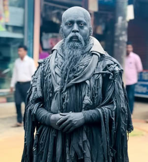 এম,এ আহমদ আজাদ, নবীগঞ্জ থেকে ॥ পরিচয় লুকিয়ে ছদ্মবেশে কালিবাবা সেজে ২০ বছর। তিনি ঢাকা-সিলেট মহাসড়কের দরবেশ। সবাই তাকে কালিবাবা বলে ডাকে। প্রতিদিন ঢাকা-সিলেট মহাসড়কের রুস্তমপুর টোল প্লাজায় চাঁদা তোলা তার কাজ। মানুষের সাথে কথা বলেন না। শুধু হাত পেতে টাকা নেন। কাউকে ছবি তুলতে দেন না। কেউ জোর করে ছবি তুলতে গেলে বিশ্রি ভাষায় গালি গালাজ করেন। আবার টাকা দিলে অথবা একটি টাইগার দিলে খুশি। সাপ ও কাঁচা মাছ চিবিয়ে খান। এসব দৃশ্য দেখে অনেক মানুষ তার ভক্ত হয়েছেন। বিশেষ করে মহাসড়কের উপর দিয়ে যাতায়াতকারী অনেক নারী ভক্ত তাকে নানা রকম উপটোকন দিয়ে থাকেন। এই কালিবাবা আগে ৫শ’ টাকা দিলে সবার সাথে সেলফি দিতেন, এখন আর সেলফি দেন না। তাকে নিয়ে মানুষের মাঝে নানা আলাচনা রয়েছে। আসলে কি তিনি পাগল না ছদ্মবেশি প্রতারক। তিনি সকাল ৮ টা থেকে দুপুর ১২ টা পর্যন্ত ও বিকেল ৩টা থেকে গভীর রাত পর্যন্ত পর্যন্ত ঢাকা-সিলেট মহাসড়কের রুস্তমপুর টোলপ্লাজায় চাঁদাবাজি করেন। বিভিন্ন ধরণের গাড়ি থামিয়ে টাকা তুলেন। আবার অনেক গাড়ি বা যাত্রীরা নিজেই স্ব-ইচ্ছায় তাকে টাকা দেন। প্রতিদিন ৩ থেকে ১০ হাজার টাকা পর্যন্ত আয় হয়। তাকে এসব বিষয়ে জিজ্ঞ্যেস করলে তিনি বিশ্রি ভাষায় গালিগালাজ করে বলেন, টাকা তুললে তোর কি’। আমি টাকা তুলে খাই, তুই কেন ডিসি এসপি কিচ্ছু করতে পারবে না। তাকে টাকা না দিলে অনেক সময় গাড়িতে পাথর দিয়ে ঢিল ছুড়ার জন্য থাক করেন, তখন গাড়ি থামিয়ে চালক তাকে টাকা দেন। টোল প্লাজায় কর্মরত ইমান আলী ও আব্দুশ শহীদ বলেন, ‘এই কালিবাবা প্রতিদিন রুটিন মাফিক টাকা তুলেন। কাউকে কাছে গেলে টাকা দিতে হয় আর না হয় গালাগাল করেন। মা-বাবাকে নিয়ে বিশ্রি ভাষায় গালাগাল করে থাকেন তিনি। কাউকে ছবি তুলতে দেন না, কেউ তাকে বেশি টাকা দিলে ছবি তুলেন। তারা বলেন, আমরা শোনেছি তার বউ বাচ্চা সবই আছে, এটা তার একটা ছদ্মবেশ।