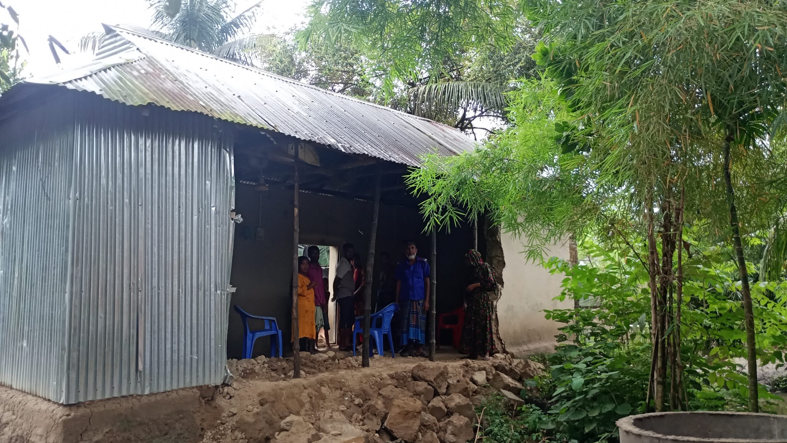 জানা যায়, শুক্রবার রাতে ভারী বৃষ্টিপাতে মৃত বীরমুক্তিযোদ্ধা আব্দুল মজিদের ছেলে মঈন উদ্দিন মনুর মাটির ঘরের দেয়াল হঠাৎ ভেঙে পড়ে। এ সময় ঘরের ভেতরে মঈন উদ্দিন মনুর স্ত্রী-সন্তানরা অবস্থান করছিলেন। দেয়াল ধ্বসে মঈন উদ্দিনের স্ত্রী আহত হলেও অলৌকিকভাবে তার সন্তানরা ছিল অক্ষত।